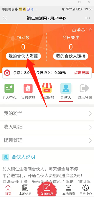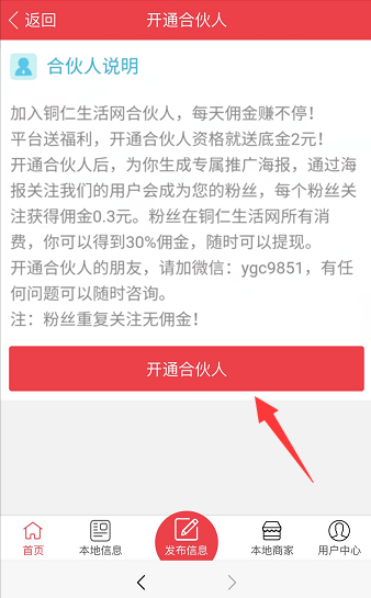 如何開通合伙人直接登錄你的賬號,沒有賬號也可以直接使用微信登錄點擊合伙人點擊開通合伙人開通后直接送2元底金如何賺傭金點擊我的合伙人海報,把海報保存到手機,分享到朋友圈或好友好友掃碼(長按識別二維碼)關